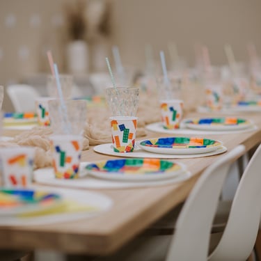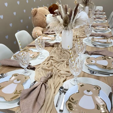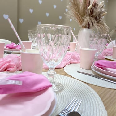 Baltos lėkštės, padėkliukai, įrankiai, medžiaginės servetėles, stiklinės, stalo takelis, sausuolių puokštelės, vienkartiniai indukai (lėkštutės, puodukai, šiaudukai, servetėlės).